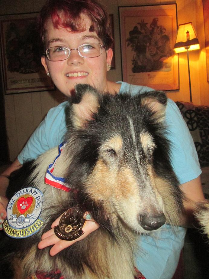 Congratulations Emily & Sadie highest award for Therapy Dog Work recognized by AKC- Distinguished, over 400 visits!