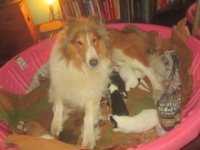 Gabby with her first litter of puppies, 1 sable,1 sable headed white,2 tri headed white's, 3 tri colors, all beautiful dob 12-8-15